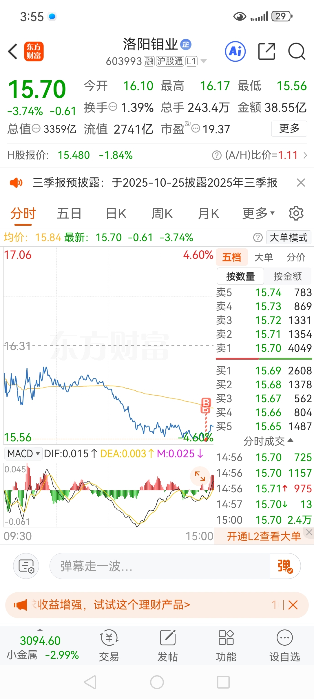 $洛阳钼业(SH603993)$ 我现在不格局了,早上卖下午买。最好两点五十