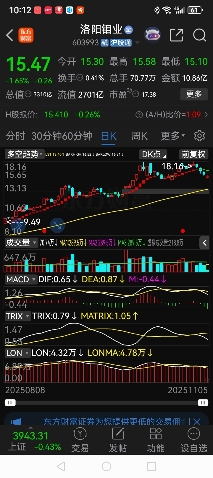 $洛阳钼业(SH603993)$ 发出绿点卖出卖出,到达黄线红点发出买入买入。