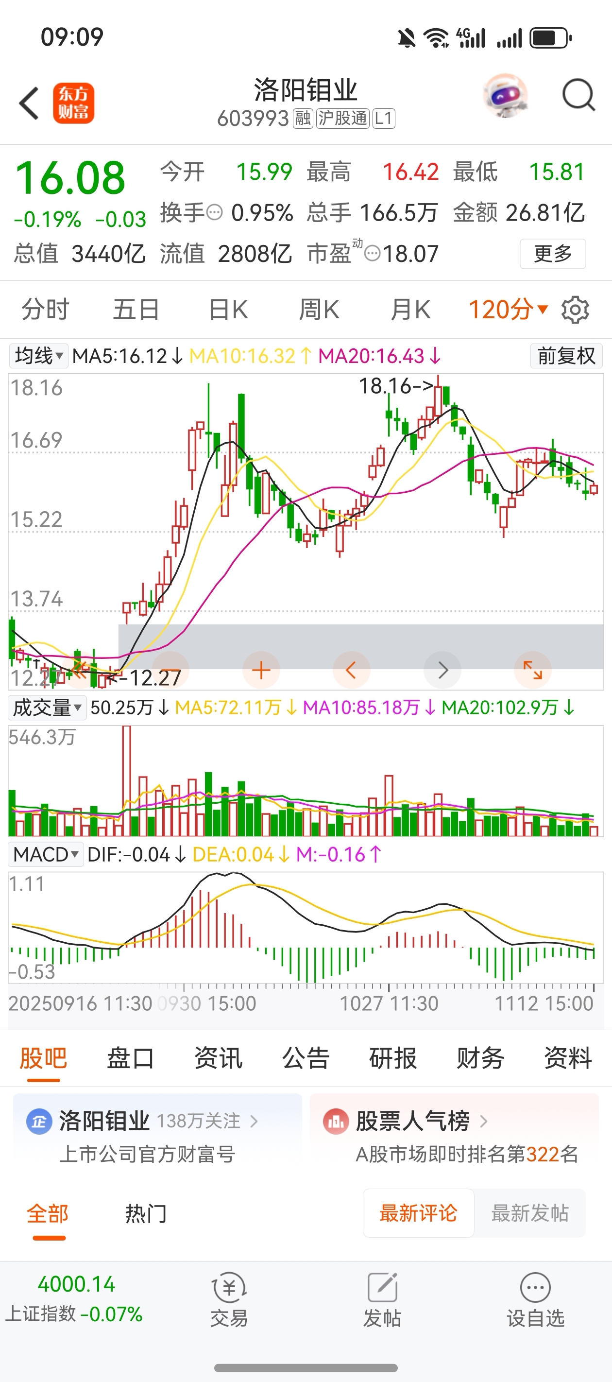 $洛阳钼业(SH603993)$ 股价在120分钟线是一个压力位,股价不突破120分钟线,线不走平不向右倾斜向上,基本没戏。个人的一点观点,不构成你的投资理念和操作。注意规避大盘和个股向下的风险。