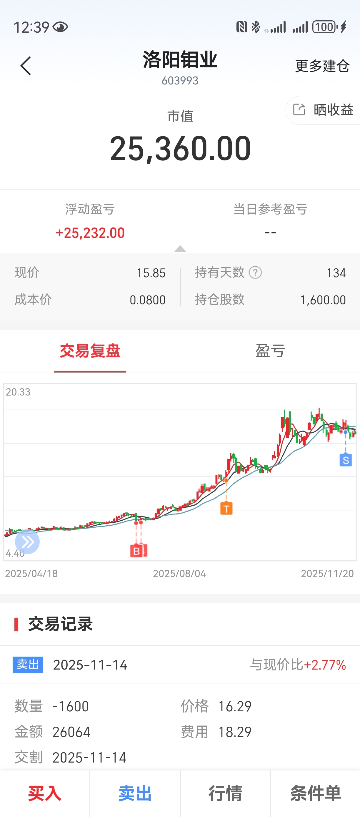 感觉洛阳钼业赚大钱的机会没多少了现在全是利润在奔跑,还没反弹到我卖出的位置,半年