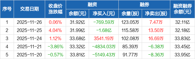洛阳钼业:融资净偿还769.59万元,融资余额31.92亿元(11-26)