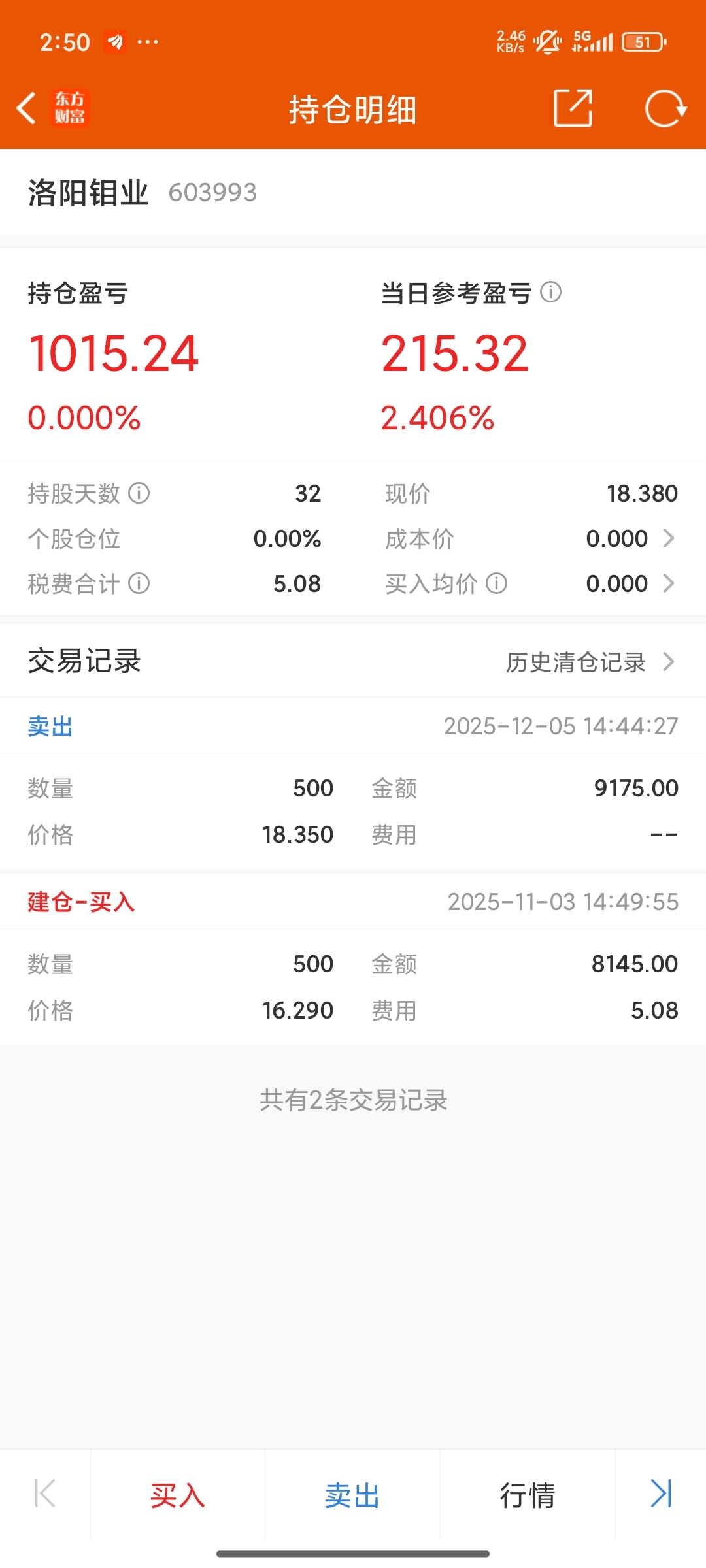 $洛阳钼业(SH603993)$ 清仓,留住利润。