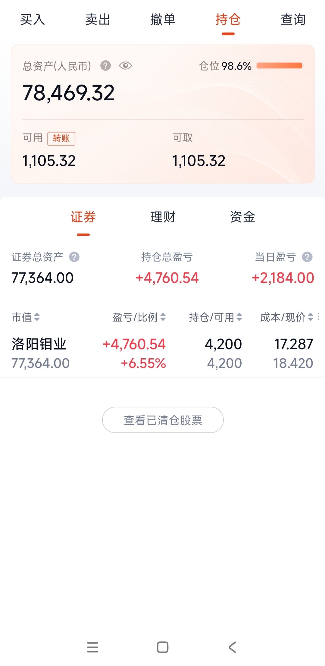 新手宝妈,挪子金库,9万入市,勇闯大A。实盘交易第98天,今日盈利2184元。今日持有洛阳钼业。