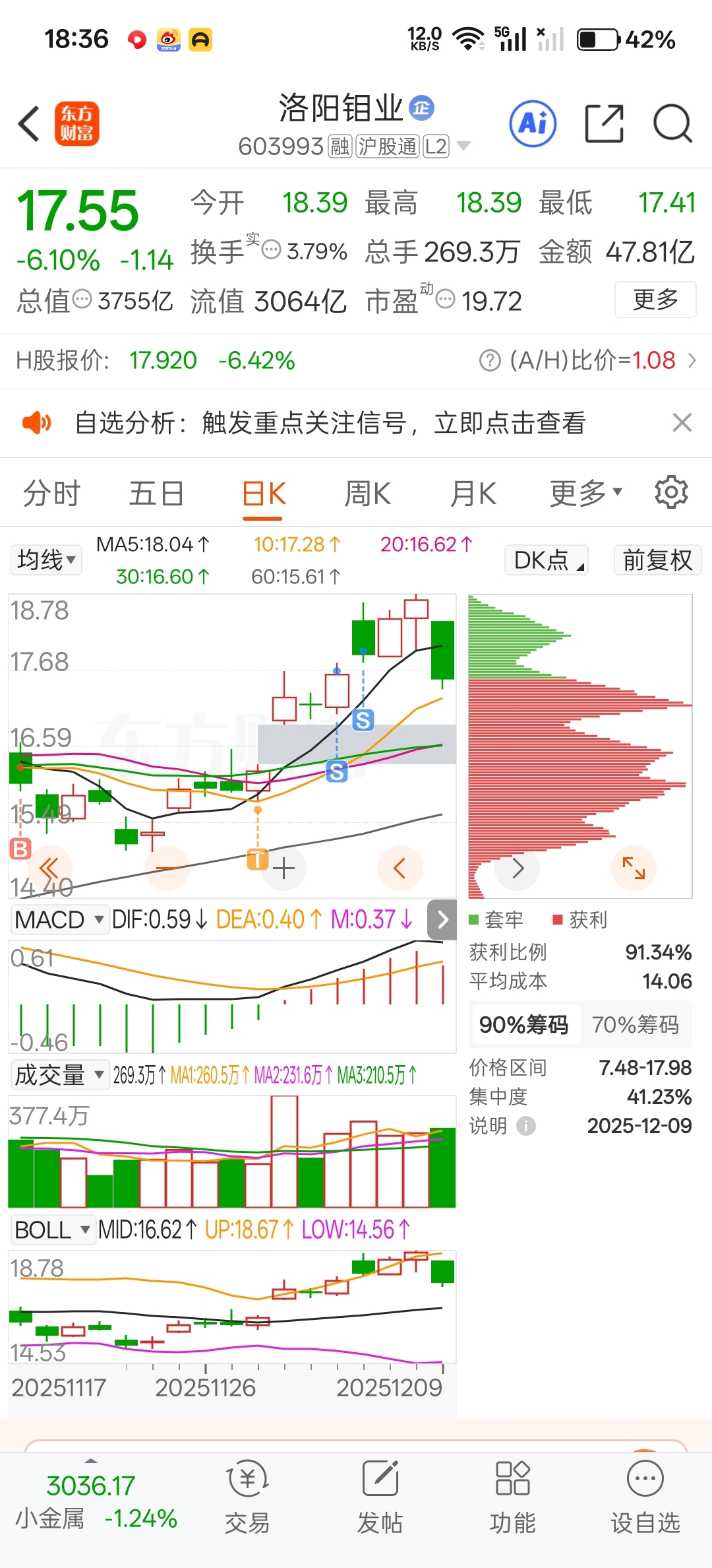 $洛阳钼业(SH603993)$ 还是挺佩服自己的,拿的住,舍得抛,在周末满天的小作文影响下没有接回。这个票长期趋势可以反复做,我还会回来的