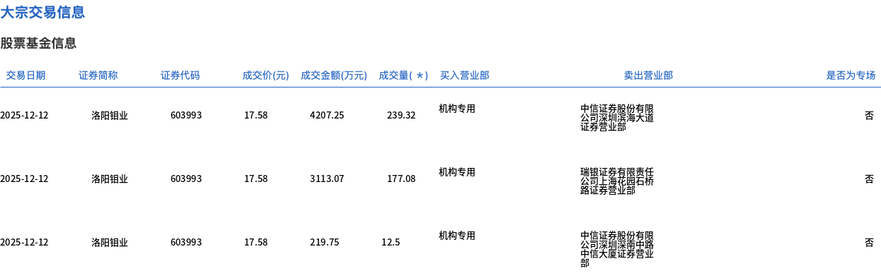 12月12日,洛阳钼业大宗交易成交428.9万股,成交额7540.07万元,占当日总成交额的1.62%,成交价17.58元,较市场收盘价17.58元持平。