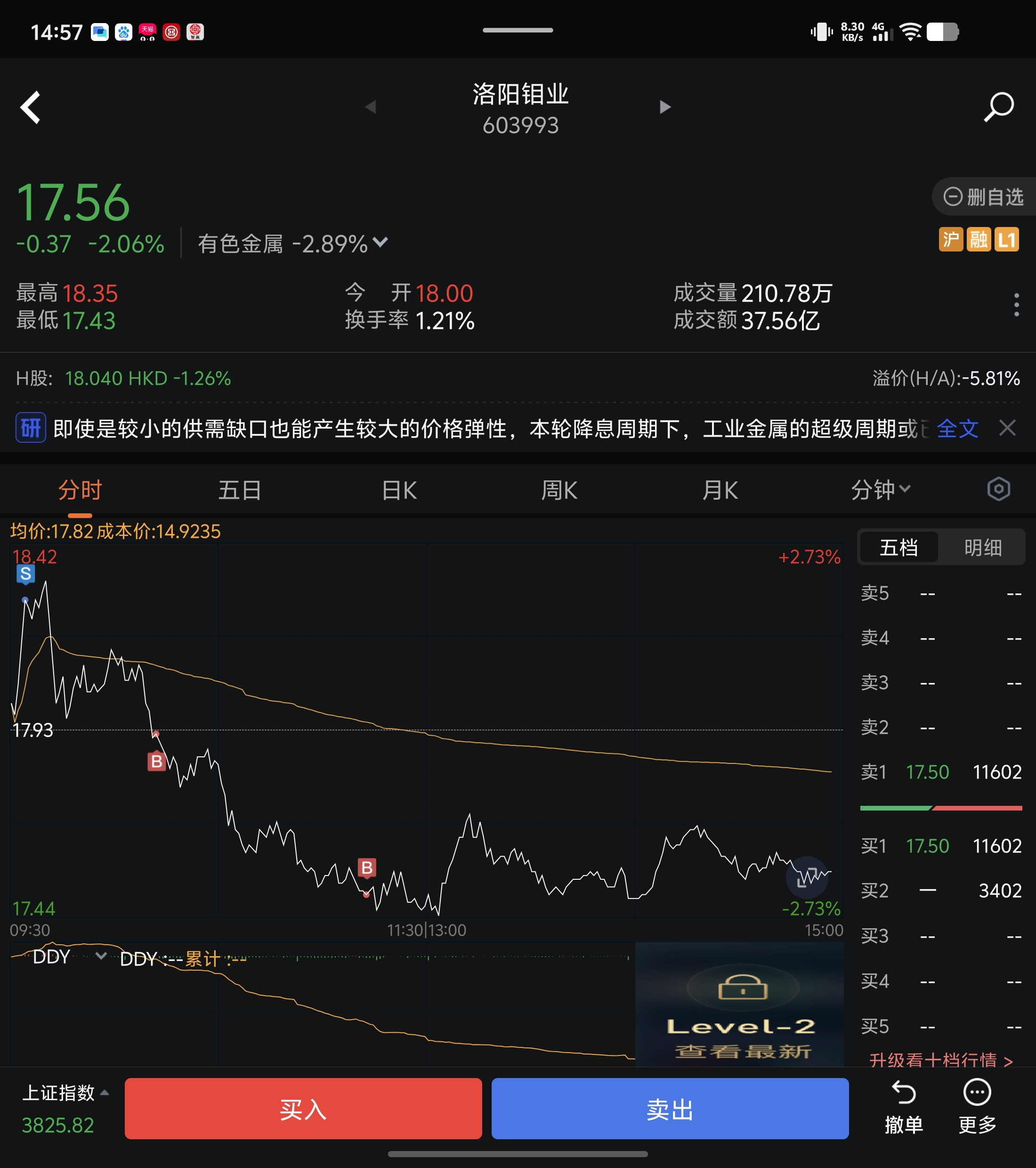 $洛阳钼业(SH603993)$ 明明还是17.56,收盘要把它打到17.5。是17.56很多卖单吗?
