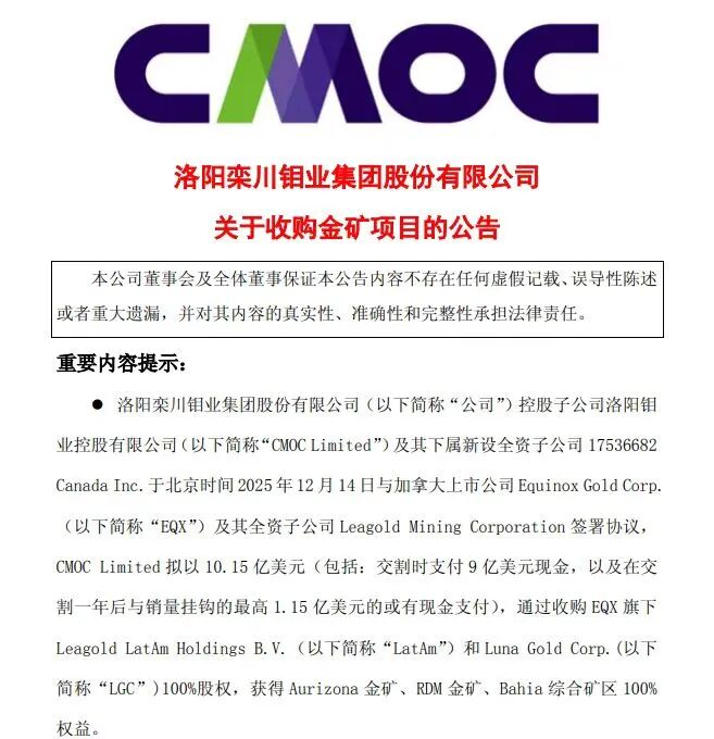 洛阳钼业宣布拟以10.15亿美元收购加拿大Equinox Gold位于巴西的四大金矿资产,包括Aurizona金矿、RDM金矿及Bahia综合矿区。合计黄金资源量501.3万盎司,储量387.3万盎司,平均品位1.88克/吨,明显高于全球在产金矿1.06克/吨的平均水平。