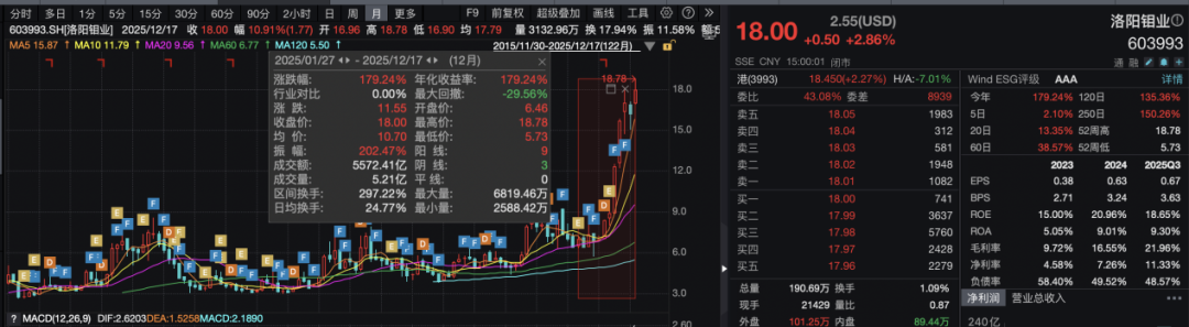此消息一出,资本市场立刻给予热烈反响。12月15日,洛阳钼业开盘强势拉升,一度涨超4%;最终收盘报17.93元/股,上涨1.99%。