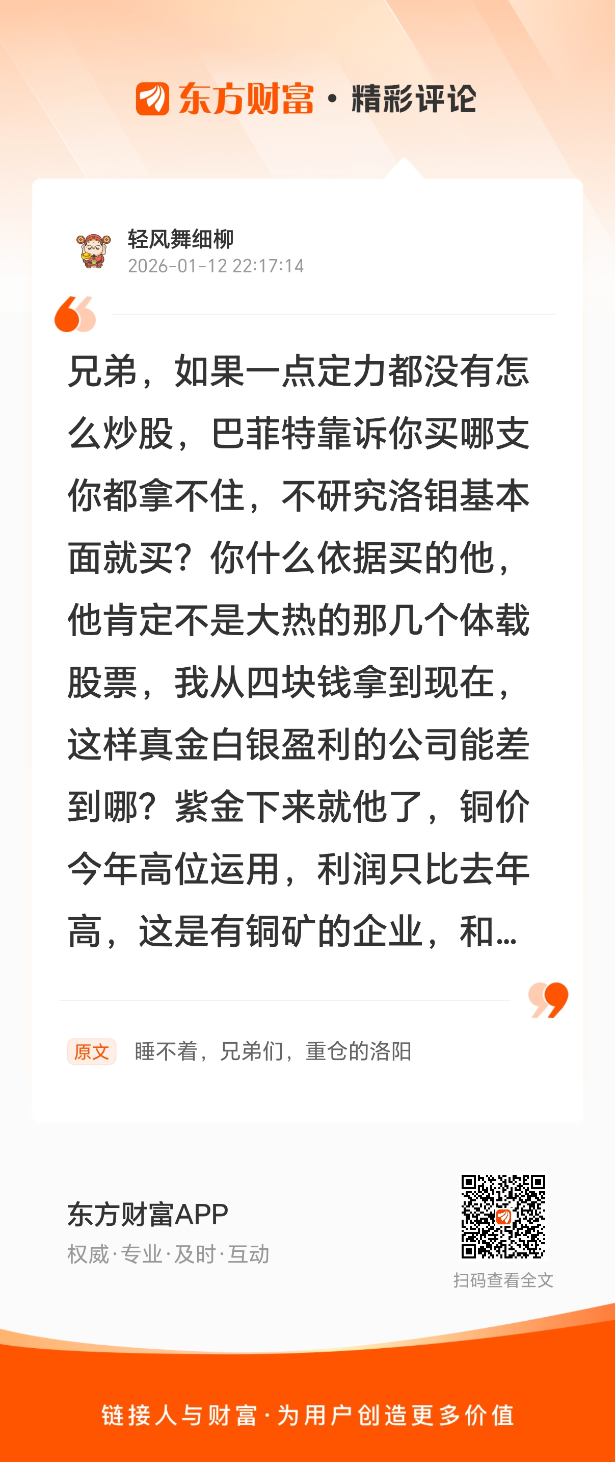 兄弟,如果一点定力都没有怎么炒股,巴菲特告诉你买哪支你都拿不住,不研究洛钼基本面就买?你什么依据买的他,他肯定不是大热的那几个体裁股票,我从四块钱拿到现在,这样真金白银盈利的公司能差到哪?紫金下来就他了,铜价今年高位运用,利润只比去年高,这是有铜矿的企业,和铜加工企业有本质区别,唯一要担心刚果金那边的政治安全,紫金一样。洛钼下半年盈收降利润反而增加,是因为不卖矿了,自己加工了,他和紫金一样在铜矿价位低的时候收矿,逆市操作,以前吧里有几个大佬拿铜资源股一两个周期的那才是赢家。我只恨今天调整的少,有五个点就好了,继续加,现在这不上不下的难受。四块八建仓,一路加加减减,从来没下过车,持股洛钼1800天的韭菜手打