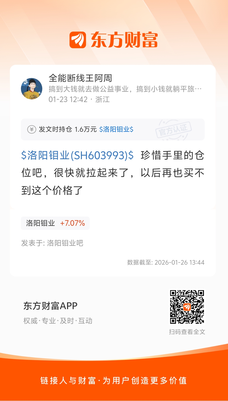 其实早就说过了,这个贵金属的话,一定是年前的大主线,行情会一直持续的,今天的价格,明天拿不到,明天的价格,后天拿不到,会一直保持新高,能接下来能做t的好机会也不多了,一不小心就踢飞筹码$洛阳钼业(SH603993)$
