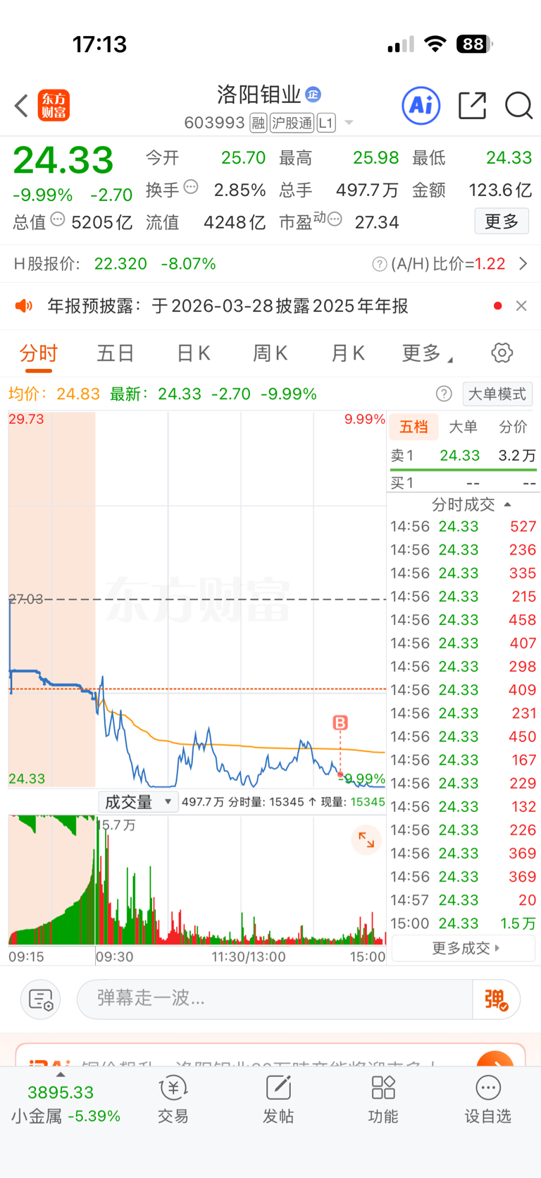 $洛阳钼业(SH603993)$ 相关板块这两天回撤比较厉害,高位进来的我个人认为没必要过度恐慌,适当减低成本,稳定情绪后会有反弹,最低看到27.24