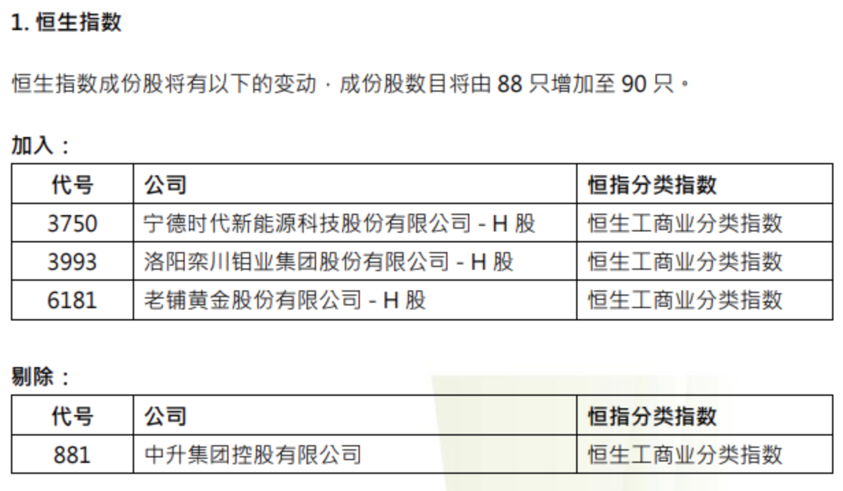宁德时代、洛阳钼业和老铺黄金将纳入香港恒生指数