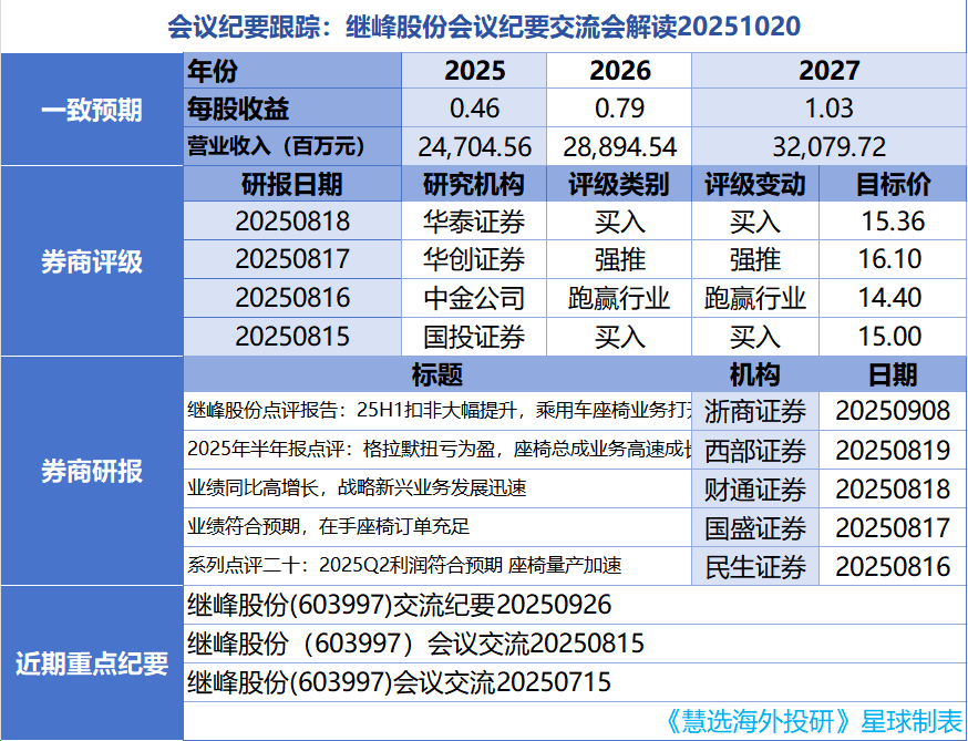 会议纪要跟踪:继峰股份会议纪要交流会解读20251020