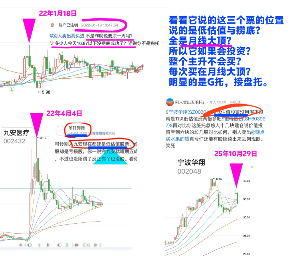 再回过来看看它这三个帖子,还低估值?捞底呢?看看这月线对应的位置?所以明显的G托接盘号。。每天在股吧装大神。哪个正常的人每周能赚20个W还天天在股吧咬人的??
