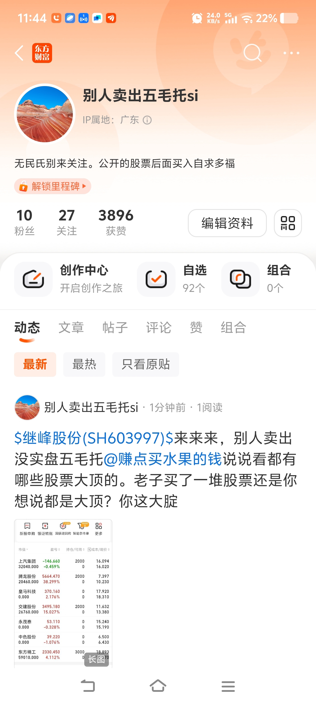 $继峰股份(SH603997)$ <a href="EastMoneyApp:at(accountid=5989335534671818 nickname=赚点买水果的钱)">@赚点买水果的钱 </a> 知道你只别人卖出没实盘五毛托的小号狗眼瞎老眼昏花老子就仁慈点都截图给你看了你往后还不是照样重复同样丢狗现眼的话