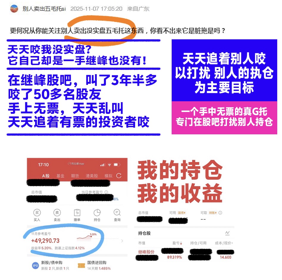 大家想想看就知道了:这三年来,一个手上没票接盘G托?(它只在22年1月18日,继峰18元边上叫人捞底?月线大顶!它就是个笑料)18元叫捞底,10元以下称这票为垃圾股?要退市?它是不是前言不搭后语? 天天追着别人咬得没完没了,是不是打扰别人卖在底部区?