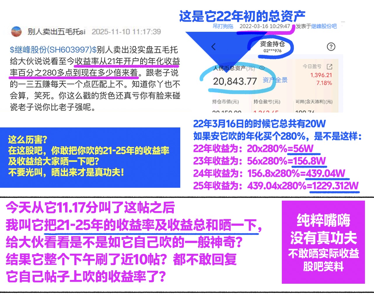 笑料终归是笑料。每天吹,吹得无边。让它晒它吹的21-25年每年的280%收益率及