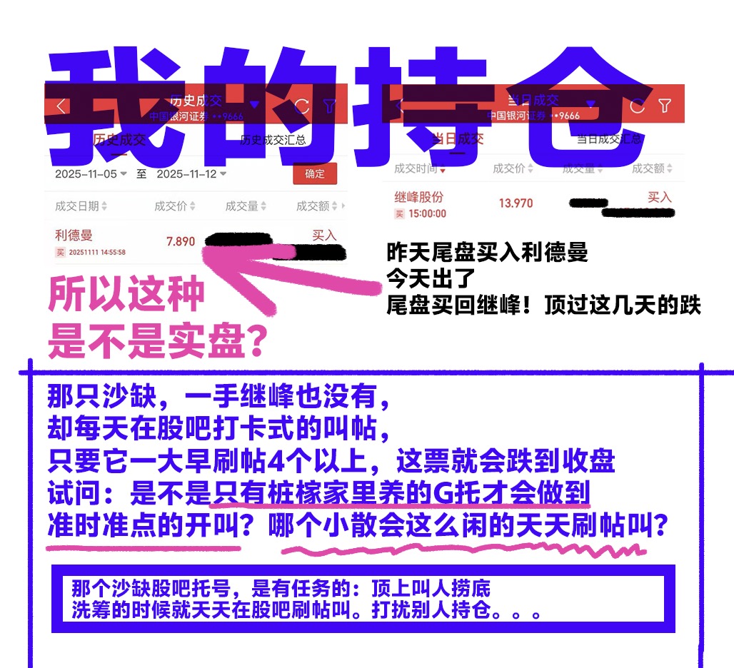 没票的接盘G托,只要它每天早上开盘之前就开始刷帖式的叫,这票就会从头跌到收盘,好神奇的。。。。它没票,却天天在股吧打卡刷帖上班,这种工作是谁派来的?你们细品!!!我幸好昨天尾盘去了利德曼!!!!!减少我在小继上的亏损!!!尾盘我又加了回来!!!666