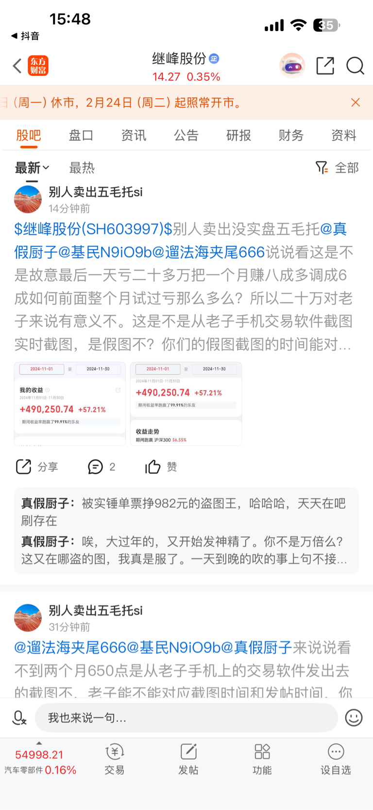 $继峰股份(SH603997)$ 被人实锤单票挣982元的“大神”成天在吧了吹,我真是服了,人不要L,天下无敌,大过年的,你没个好