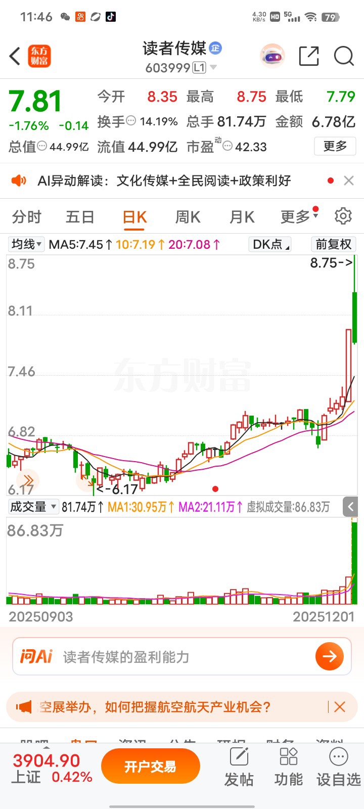 $读者传媒(SH603999)$ 完了完了套山顶了