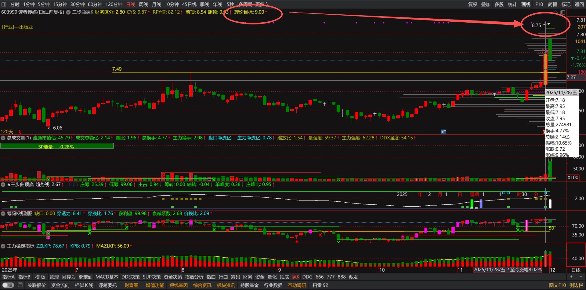 $读者传媒(SH603999)$ 短线目标到了,回调到位再来。