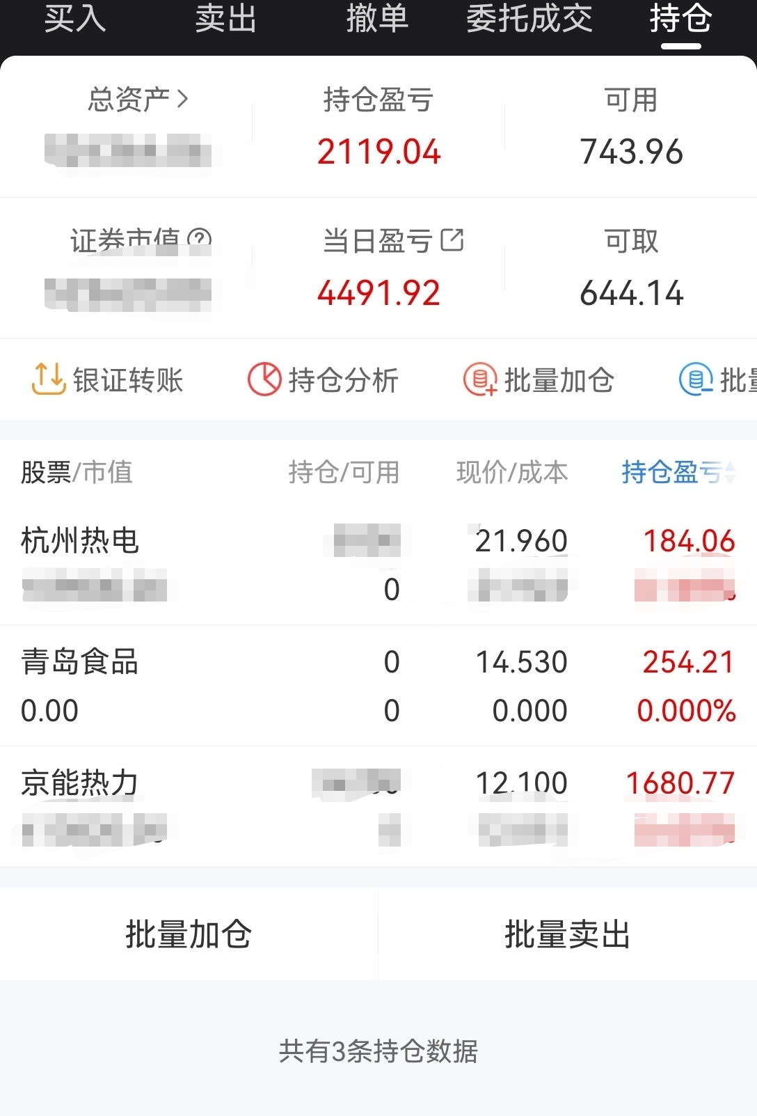 $杭州热电(SH605011)$ $京能热力(SZ002893)$ $青岛食品(SZ001219)$ 50万实盘第8天,青岛食品太弱了,自己也卖飞了,现在行情不亏钱就是赚,天气终究会变得越来越冷,明天供热高看一眼。今日盈利+4491.92