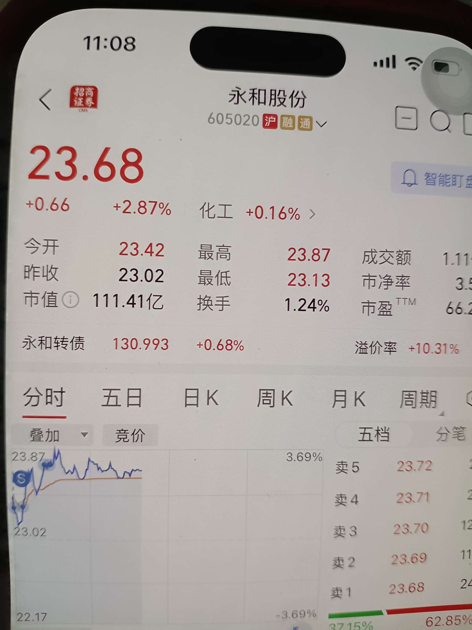 $永和股份(SH605020)$ 今天高开,好消息,开盘就卖。一会绿盘买回来。