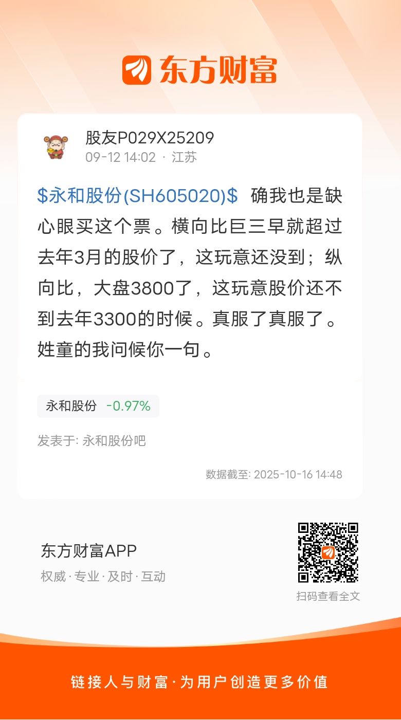 $永和股份(SH605020)$ 确我也是缺心眼买这个票。横向比巨三早就超过去年3月的股价了,这玩意还没到;纵向比,大盘3800了,这玩意股价还不到去年3300的时候。真服了真服了。姓童的我问候你一句。