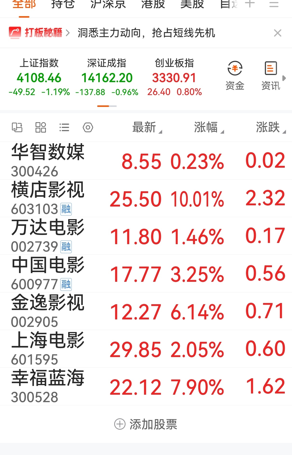 你们羡慕吗?哈哈去年到现在赚了快4倍了,只做影视股,今天11%卖的。