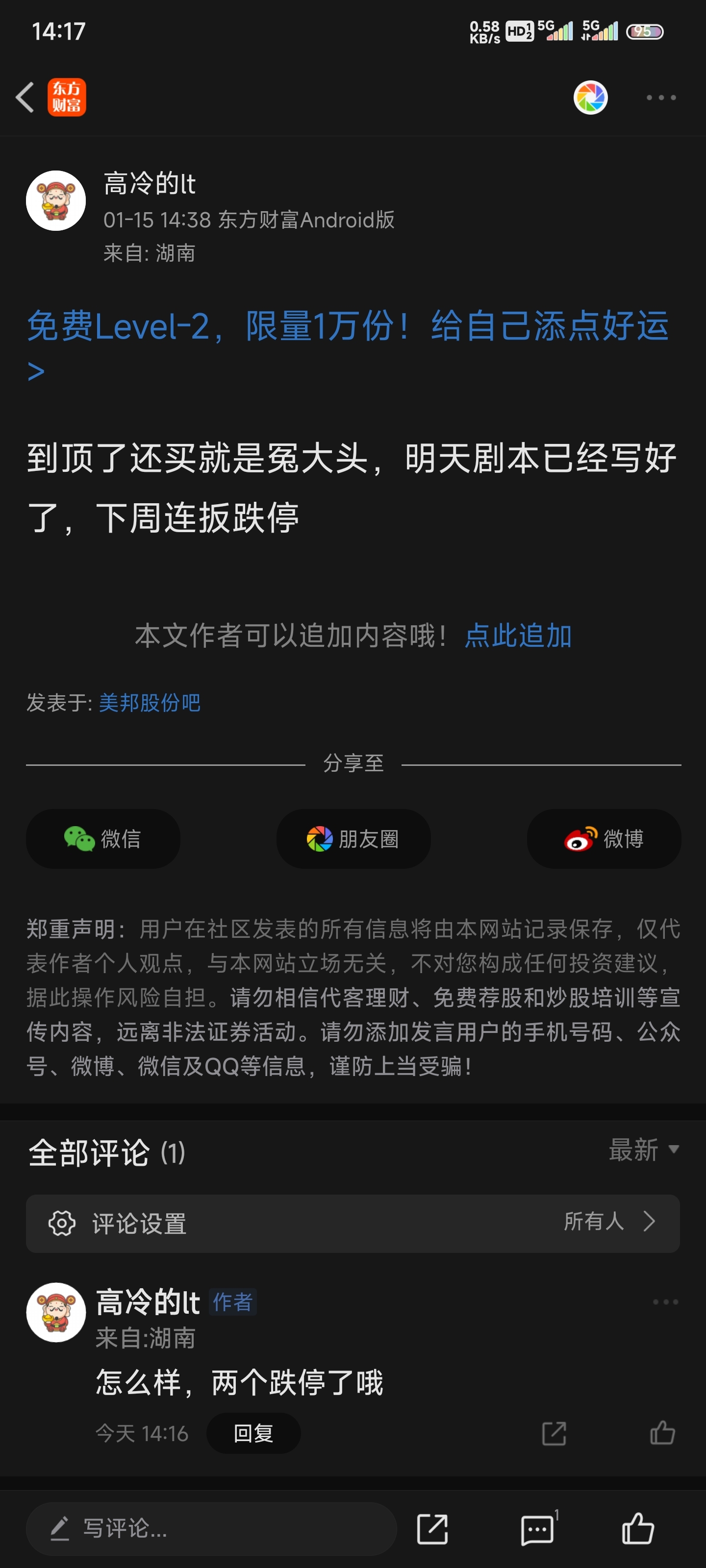 温馨提示: 1.根据《证券法》规定,禁止编造、传播虚假信息或者误导性信息,扰乱证券市场;2.用户在本社区发表的所有资料、言论等仅代表个人观点,与本网站立场无关,不对您构成任何投资建议。用户应基于自己的独立判断,自行决定证券投资并承担相应风险。《东方财富社区管理规定》