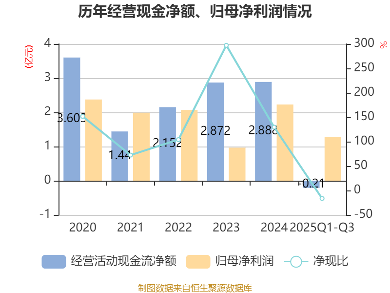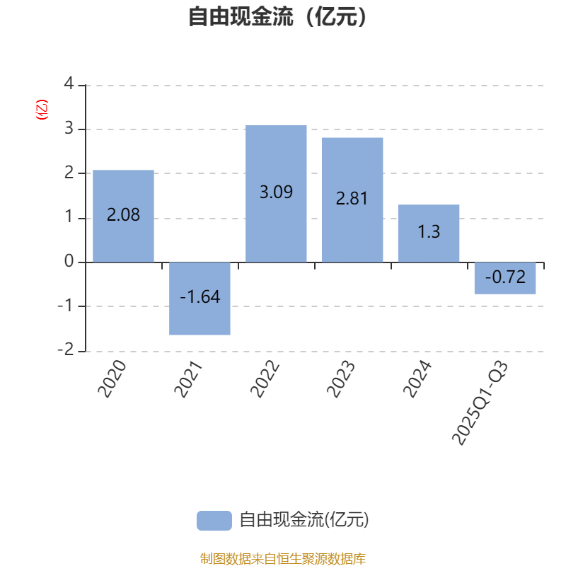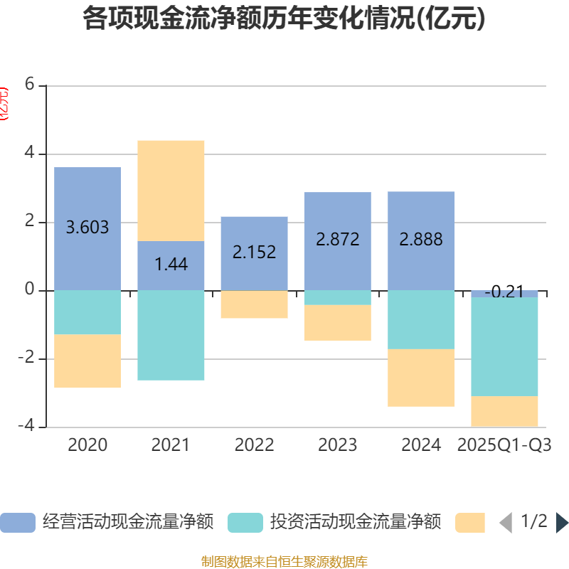 2025年前三季度,公司经营活动现金流净额为-2098.95万元,同比增加1.39亿元;筹资活动现金流净额-8853.26万元,同比增加8503.84万元;投资活动现金流净额-2.9亿元,上年同期为-5580.15万元。