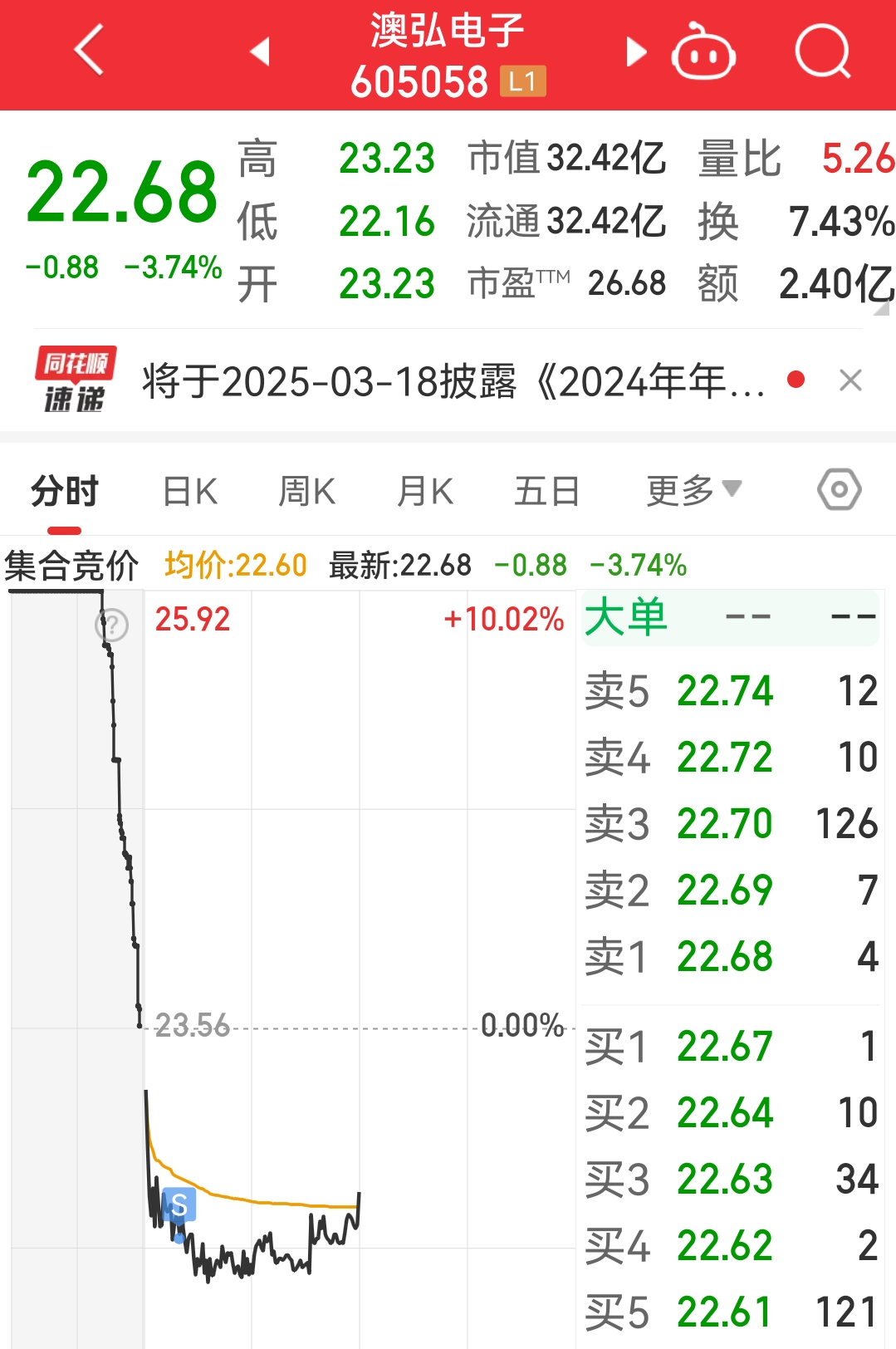 $澳弘电子(SH605058)$ 没有想到溢价都没,割了。无论盈亏都是实盘。