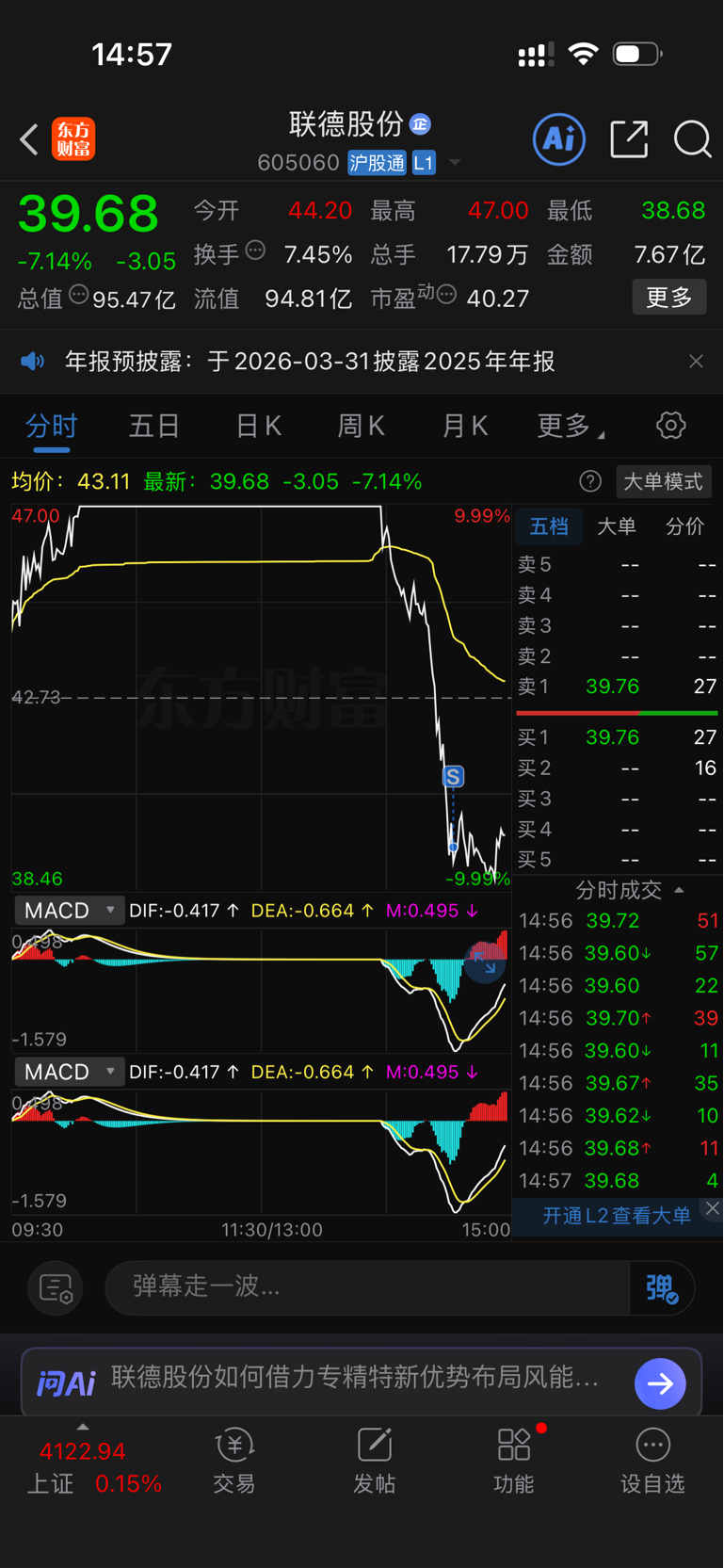 $联德股份(SH605060)$ 早上大红睡个觉起来大绿,主力真牛逼