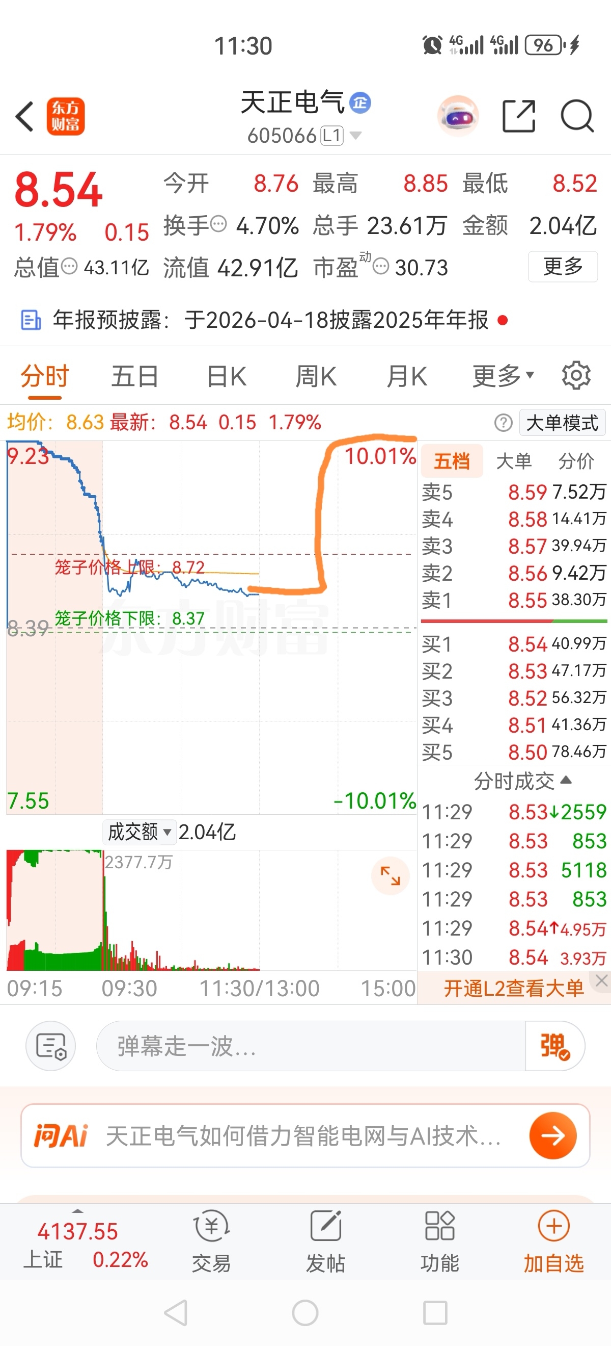 $天正电气(SH605066)$ 下午走势