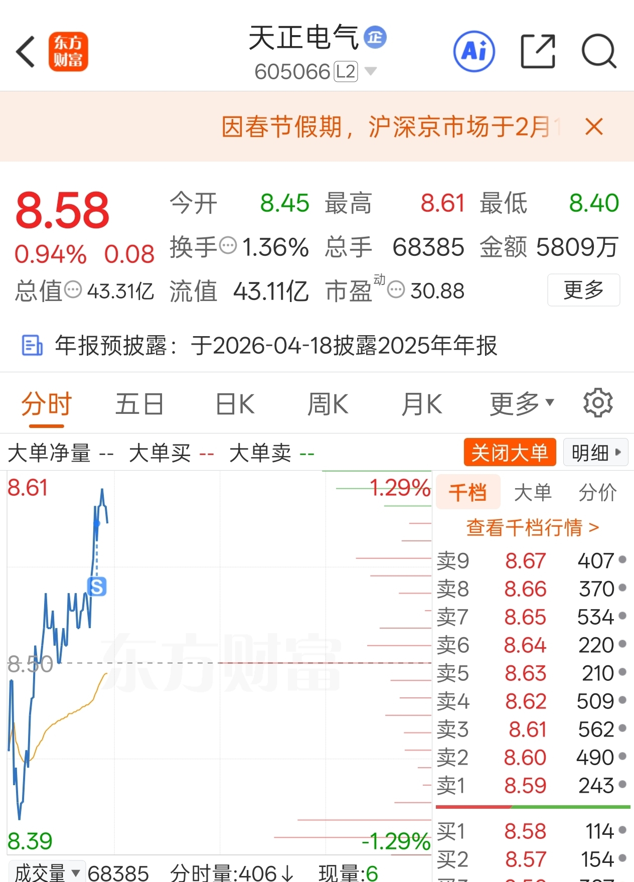 $天正电气(SH605066)$ 留了最后的300股也全出了,等跌下来再说,安全过年,黄色均线没有跟上,要回去