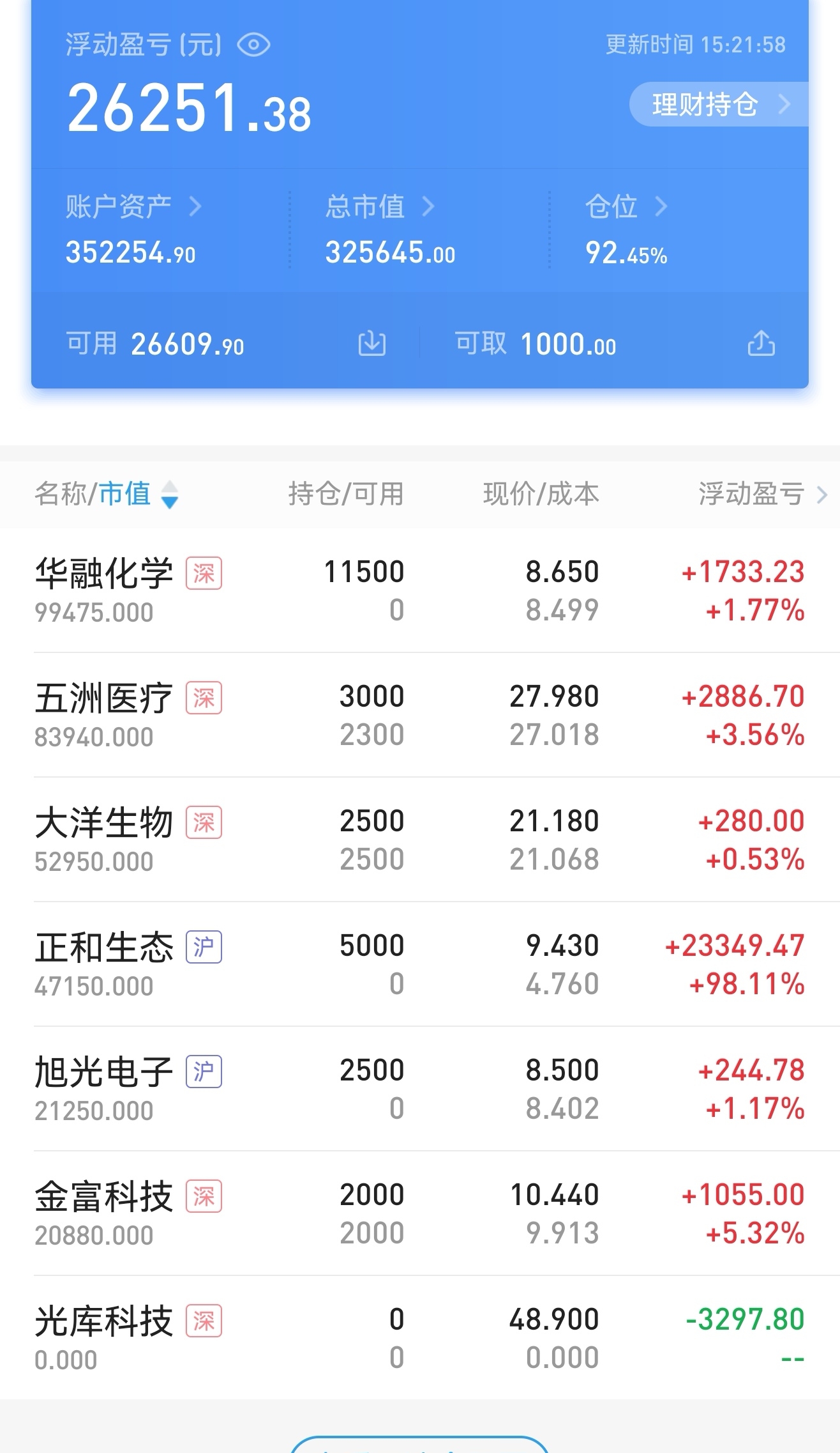 正和生态今天没有继续板了比较遗憾,盘中冲了几次都失败了。做了俩笔T尾盘走了,留下的明天不涨就跑。光库割到了地板,但是也不后悔了给自己点教训,走错了早该走,迟迟不走就是自己的问题。最近收益不错,希望能把这个节奏把握好,继续努力,加油2025。