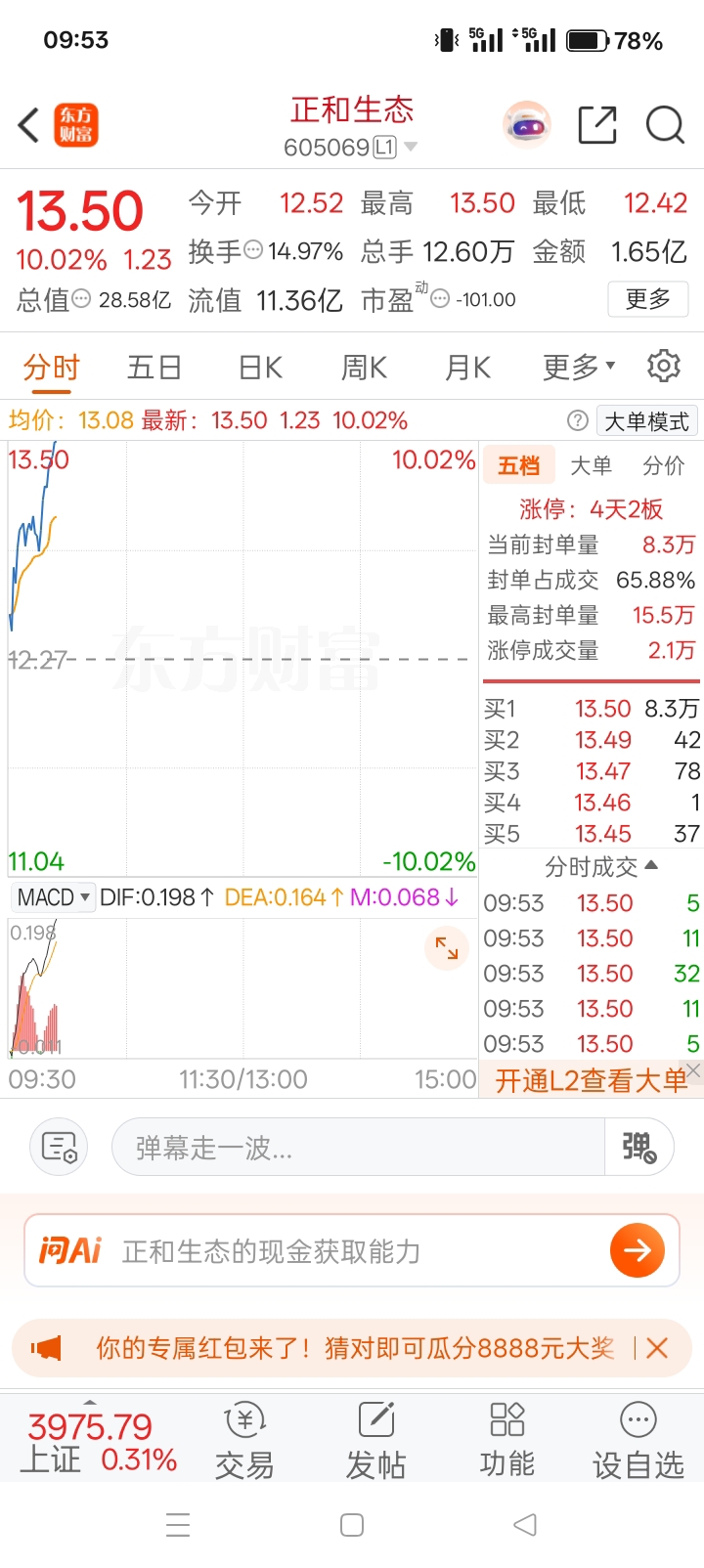 $正和生态(SH605069)$ 正和继续封板,上周贴贴告知各位的,继续吃肉已经出局的,不要灰心,还有机会!