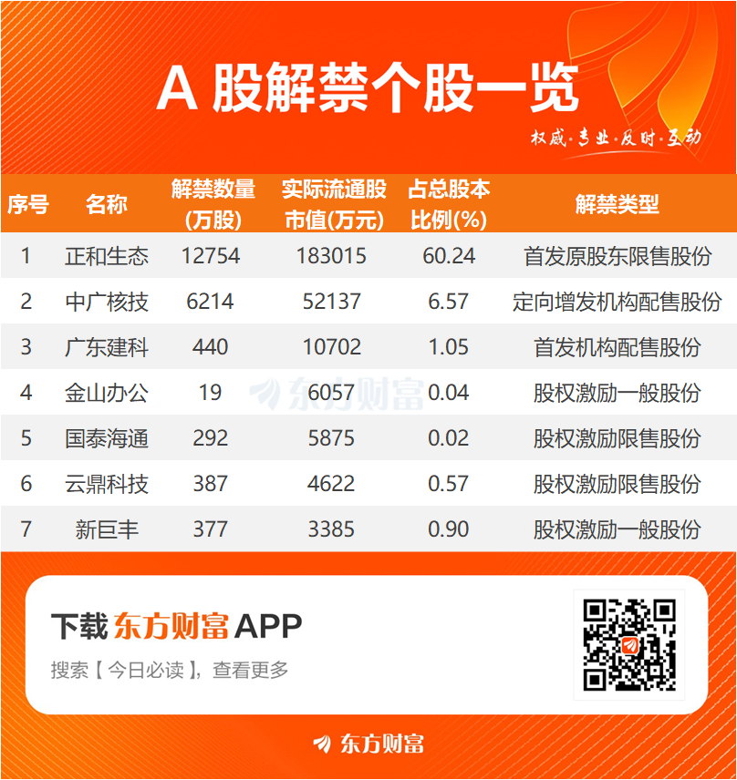【明日解禁】明日7股解禁 正和生态、中广核技解禁市值居前