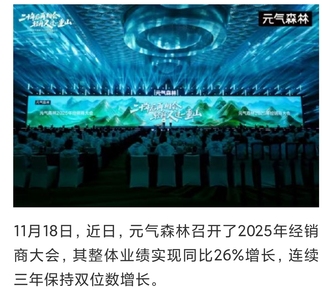 $华康股份(SH605077)$ $保龄宝(SZ002286)$ $三元生物(SZ301206)$ 元气森林2025年全国经销商大会,2025年元气森林延续增长势头,整体业绩实现26%增长。其中,外星人电解质水同比增长34%,维C橙味和夏黑葡萄味气泡水同比增长52%,冰茶系列同比增长56%,好自在同比增长36%,维生素水同比增长128%,整体销量符合且超预期。
