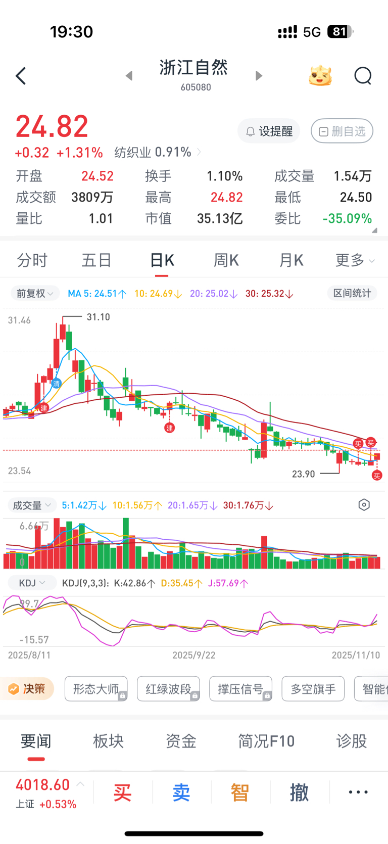 $浙江自然(SH605080)$ 第二次买这只票了,目前成本24.95,大概等几天起来了,我就快进快出了,不想过多停留,大盘目前太高位了!
