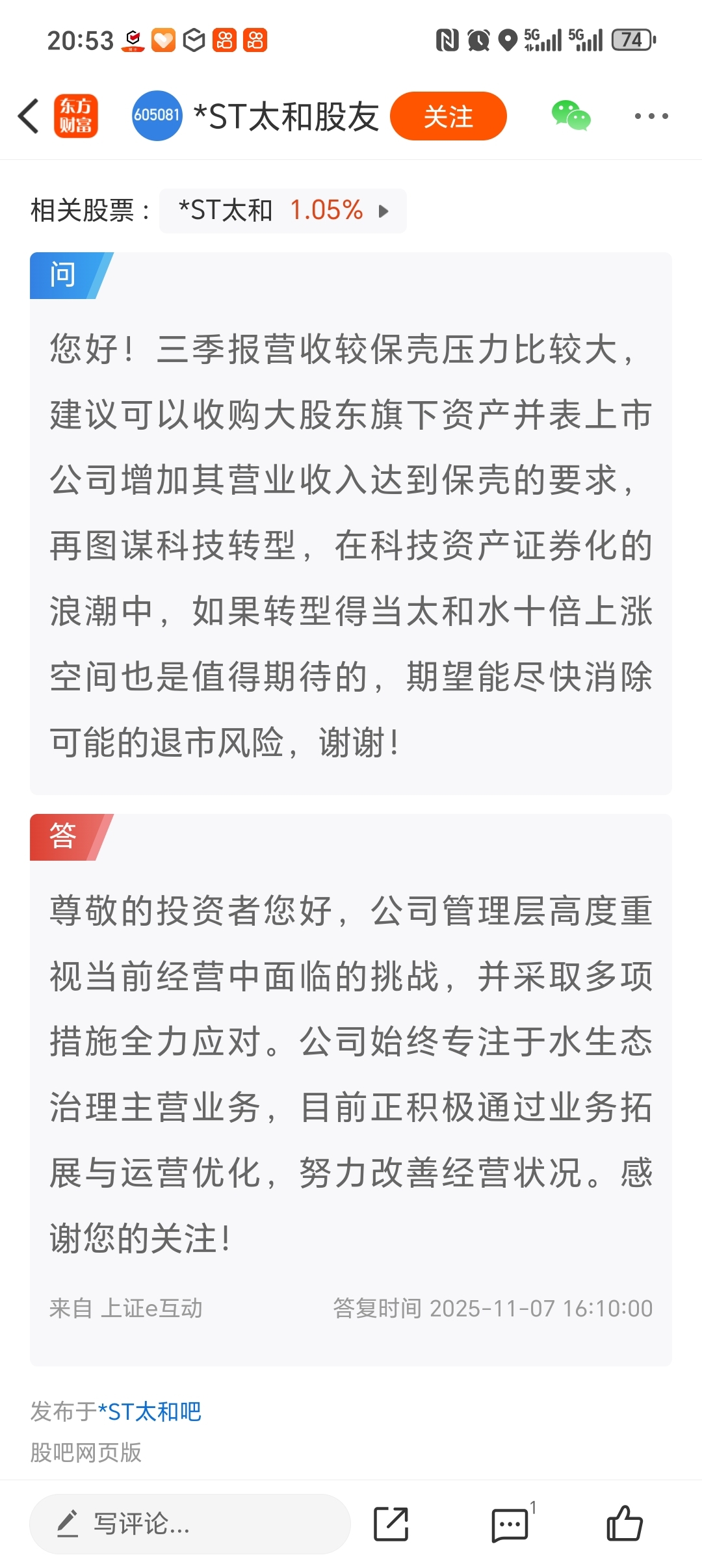 $*ST太和(SH605081)$ 今年快结束了,基本上就董秘说的主营业务保壳了没有其他方式了,很多方式时间上估计也来不及了,上市几年主营业务都没过3亿,现在就更不可能了