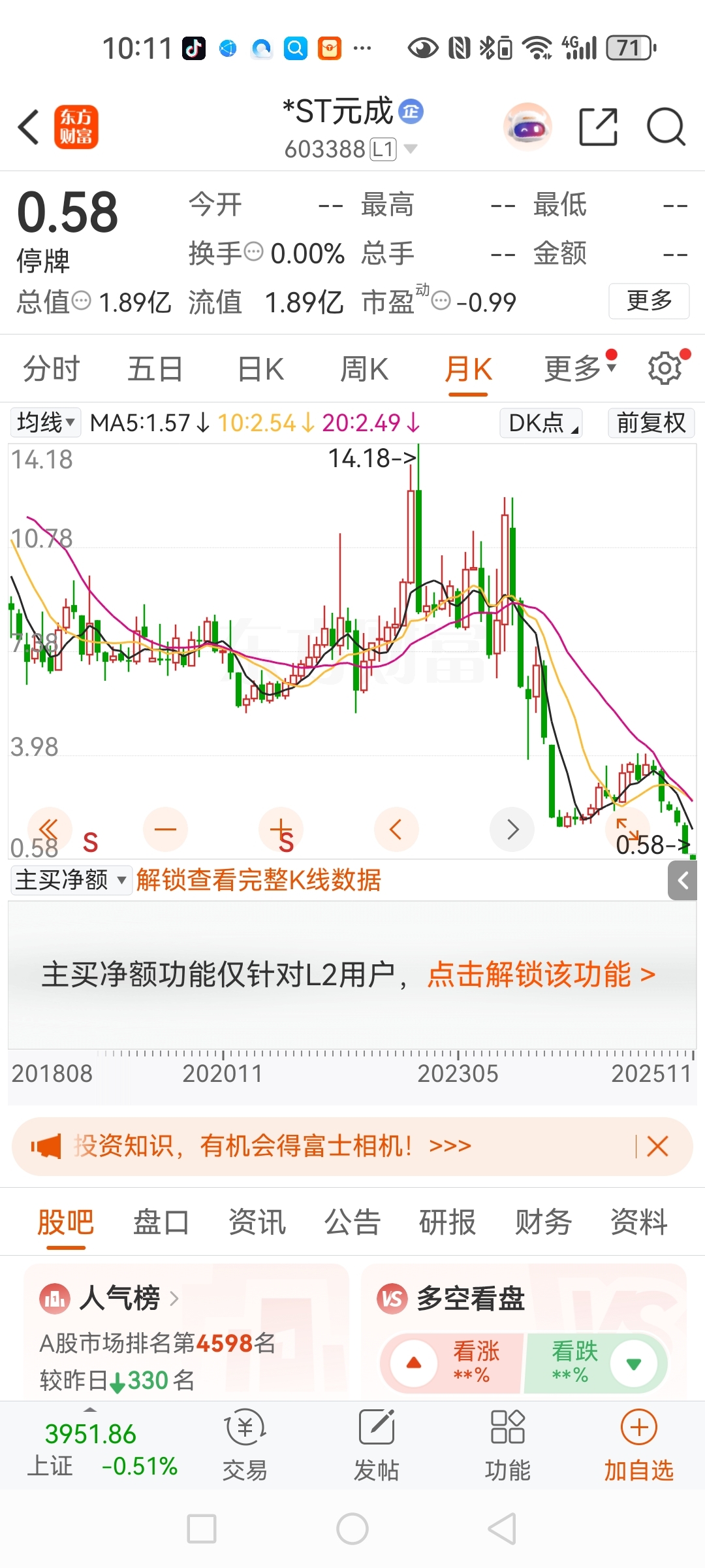 $*ST太和(SH605081)$ 这股都凉透,还有人再里面吹,净资产2两元,到三板要涨到三元