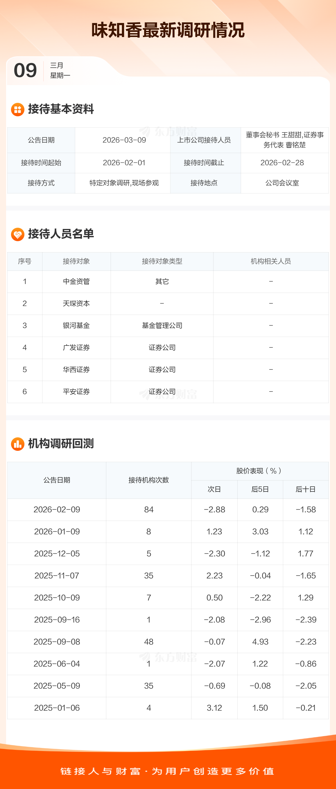 味知香3月9日公告称,2月1日至2月28日接待中金资管等6家机构调研。接待人员包括董事会秘书 王甜甜,证券事务代表 曹铭楚。