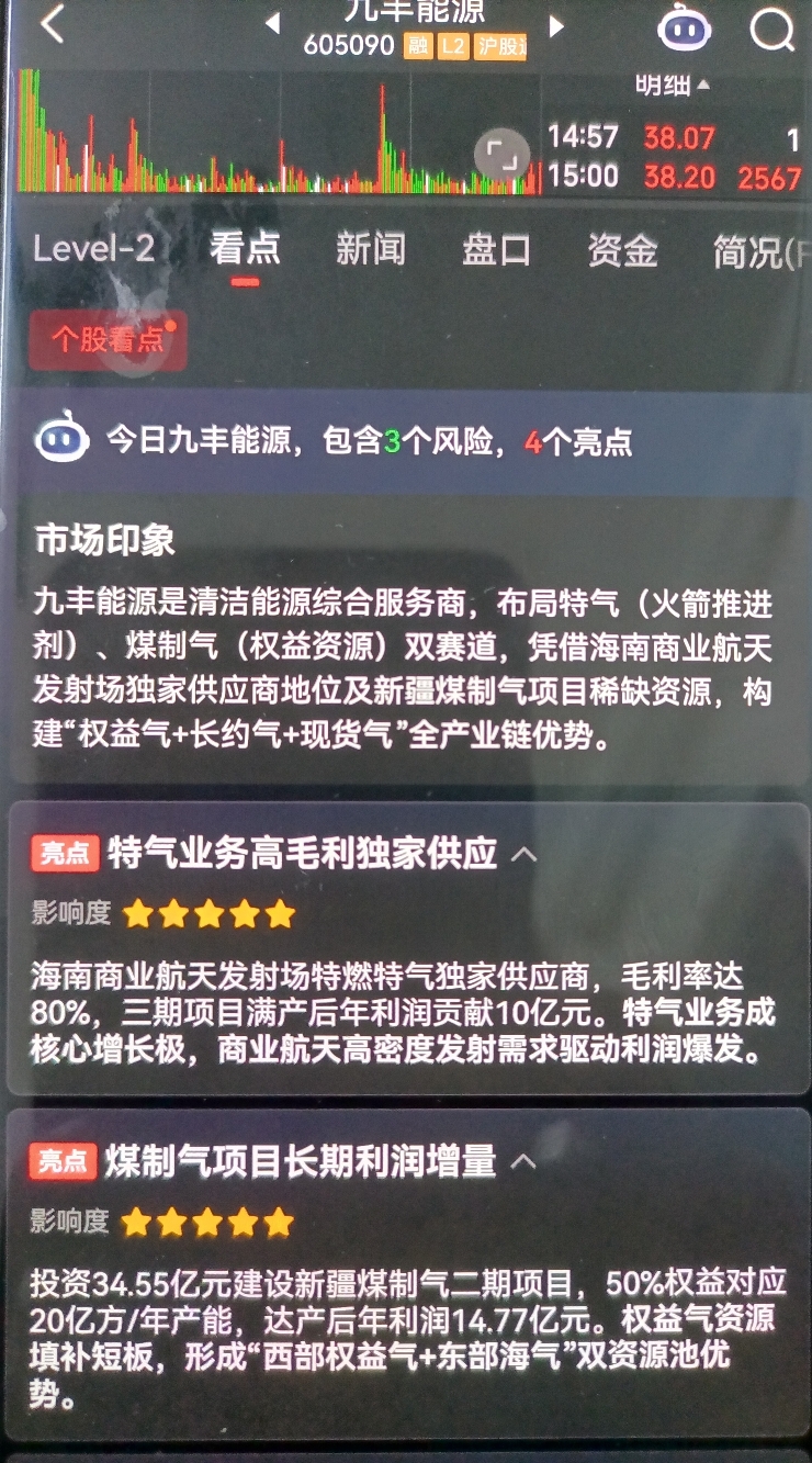 在同花顺亮点里面写着,九丰能源在海南发射场满产后,特种燃气可以年利润10亿,这才