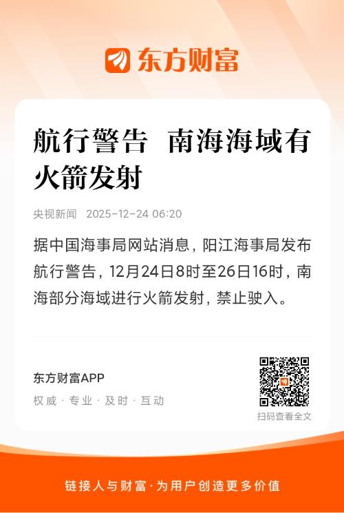 据中国海事局网站消息,阳江海事局发布航行警告,12月24日8时至26日16时,南海部分海域进行火箭发射,禁止驶入