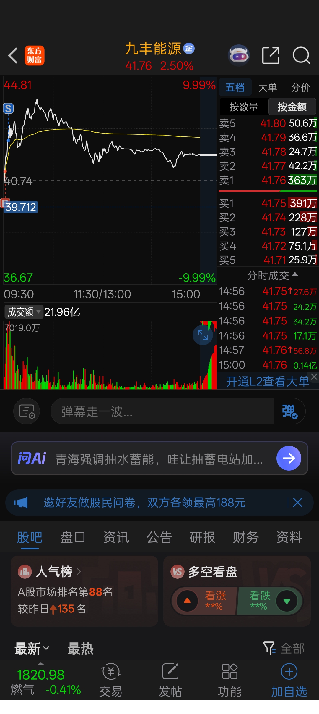 $九丰能源(SH605090)$ 五个点跑了并不是不看好,主要还是早上加仓了