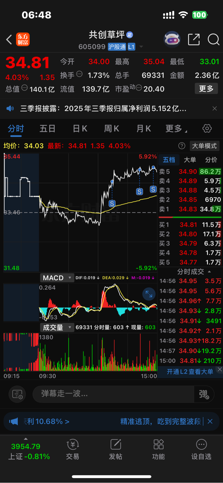 $共创草坪(SH605099)$ 还好今天稳啦一把、让昨天的损失差不多回来了,今天先减点仓看下周行情,希望能够解套、小赚点、可惜了昨天该跑一下在接回来