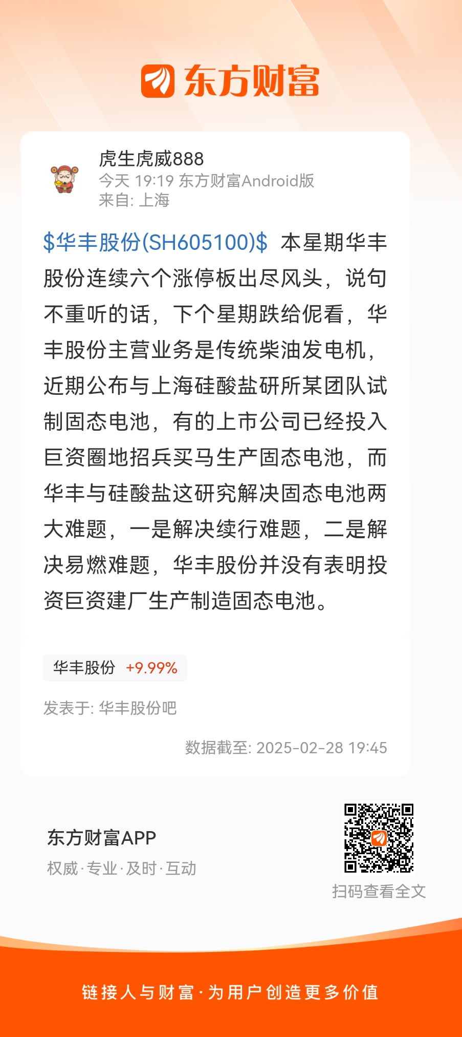 $华丰股份(SH605100)$ 本星期华丰股份连续六个涨停板出尽风头,说句不重听的话,下个星期跌给伲看,华丰股份主营业务是传统柴油发电机,近期公布与上海硅酸盐研所某团队试制固态电池,有的上市公司已经投入巨资圈地招兵买马生产固态电池,而华丰与硅酸盐这研究解决固态电池两大难题,一是解决续行难题,二是解决易燃难题,华丰股份并没有表明投资巨资建厂生产制造固态电池。