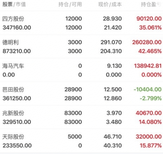 目前个人持有、四方股份、德明利、芭田股份、兆新股份、天际股份,胜不骄败不馁,祝所有老铁收获满满。