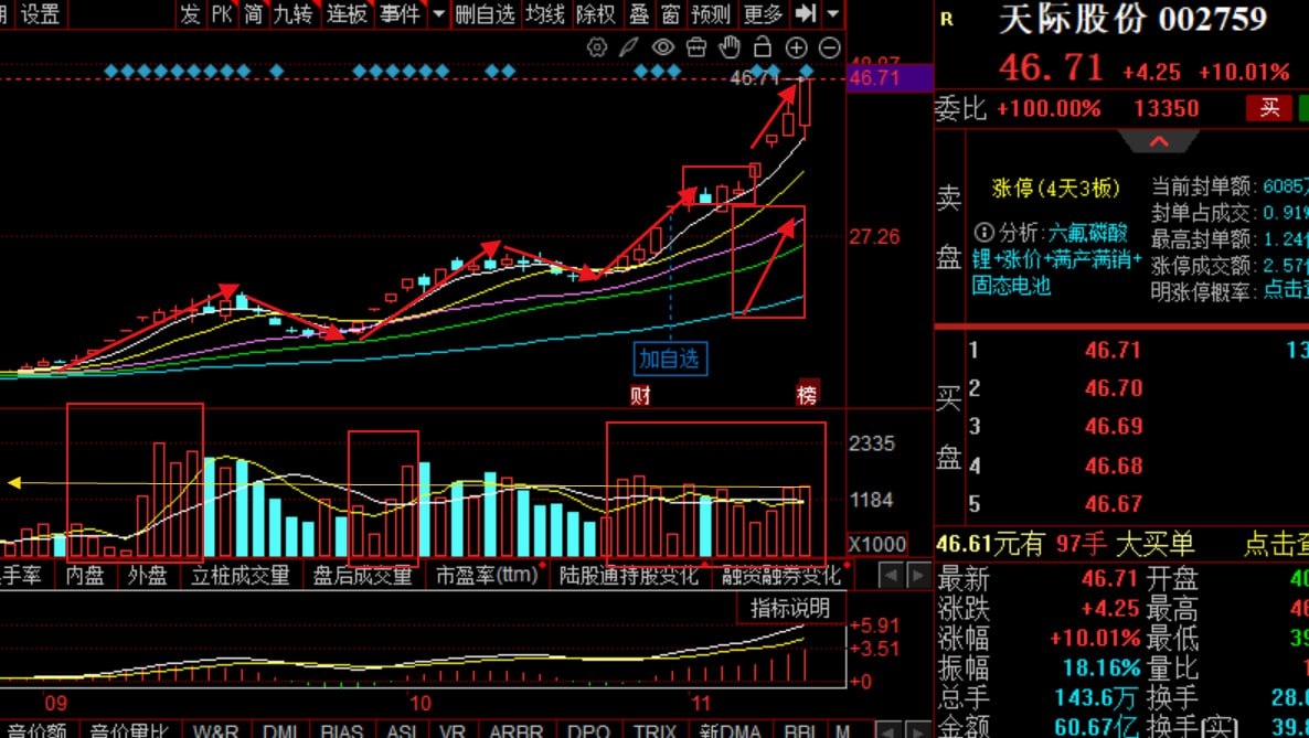 5、天际股份:电池+磷化工+氟化工概念+钠离子概念+比亚迪概念+固态电池+家用电器+宁德时代概念+融资融券+锂电池概念、持续创近几年新高,已经出现六连阳,均线多头排列,量价合理,今天在水下的同时看到量能持续增加,选择在支撑位附近挂单介入,看明天是否有好的表现,反之会选择方向。